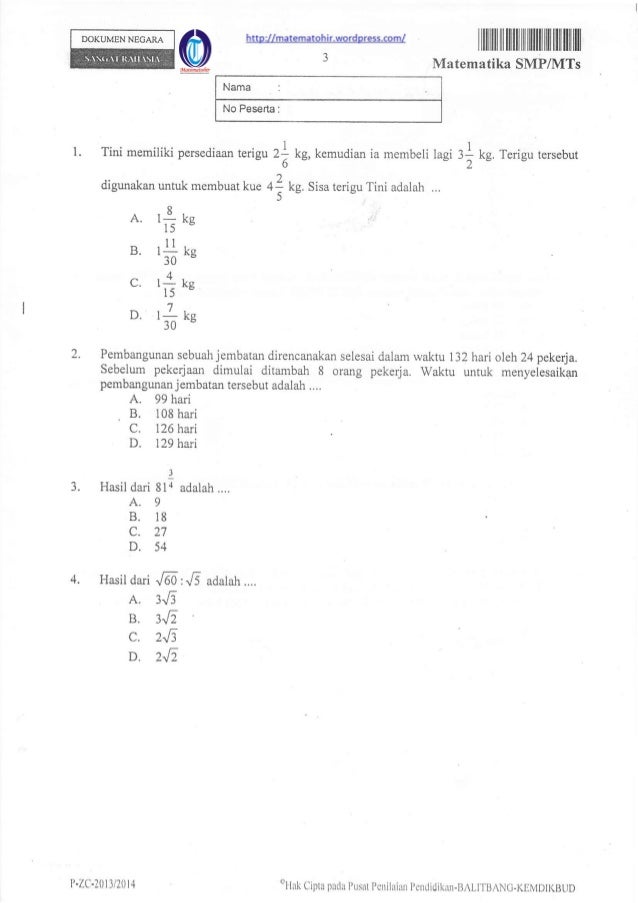 Simulasi Soal Ujian Nasional Matematika Smp Mts Tahun 2014 Lengkap